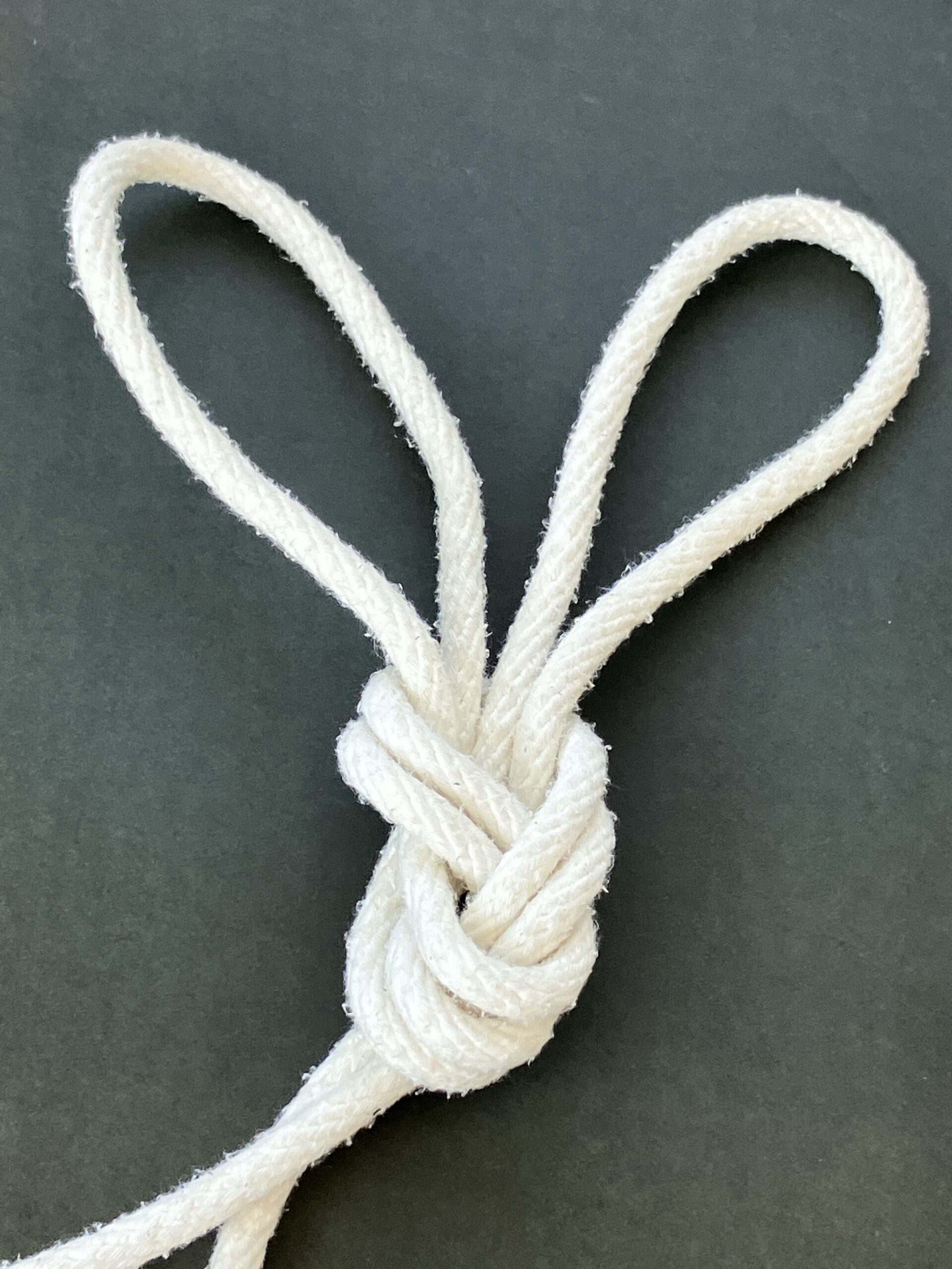 8の字ループの変形。うさぎの耳のようになっているのが特徴です。索端に2つの輪をつくルことによって,それぞれのループを支点としてロープを支えることができます。