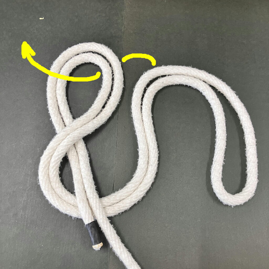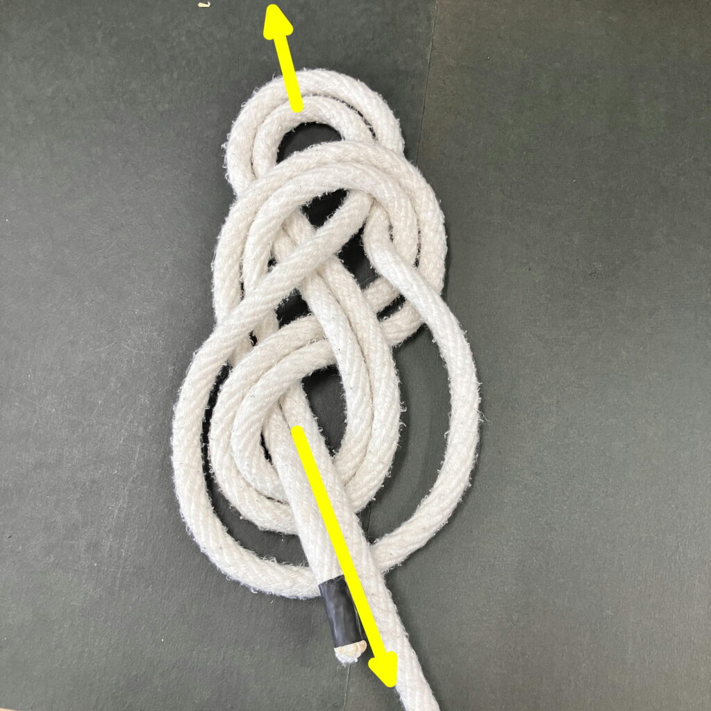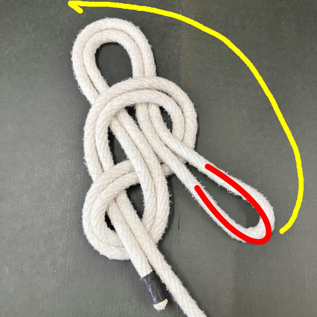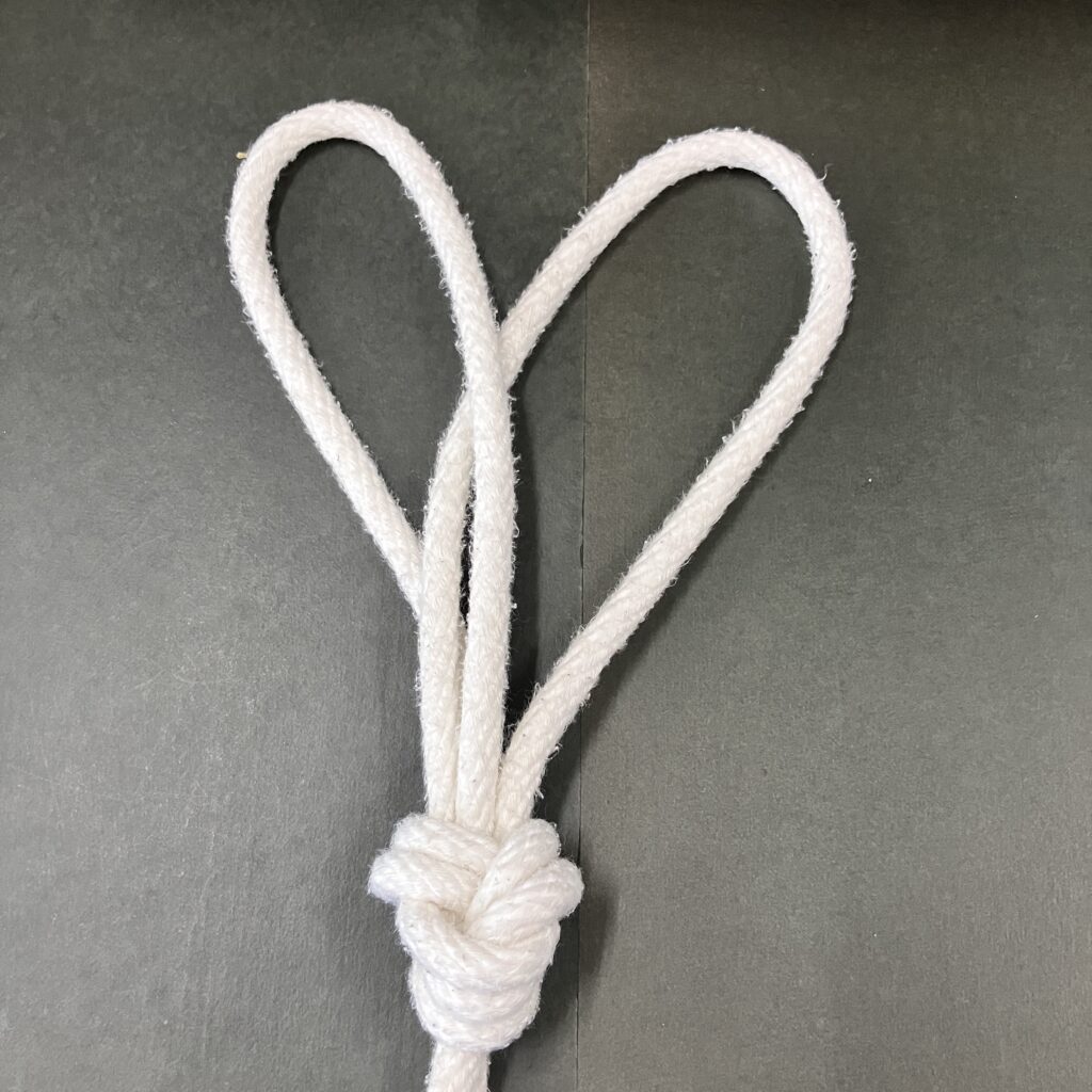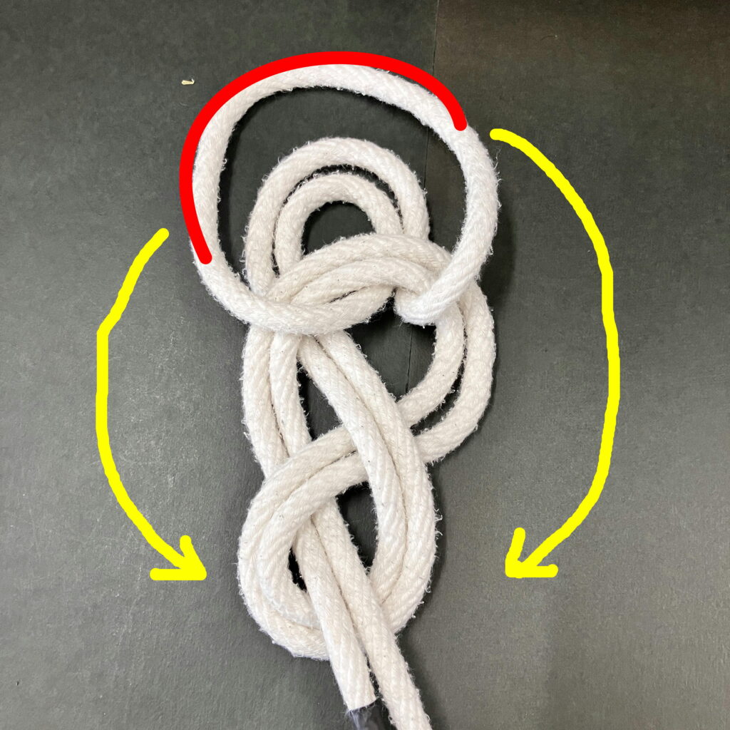 8の字ループの変形。うさぎの耳のようになっているのが特徴です。索端に2つの輪をつくルことによって,それぞれのループを支点としてロープを支えることができます。