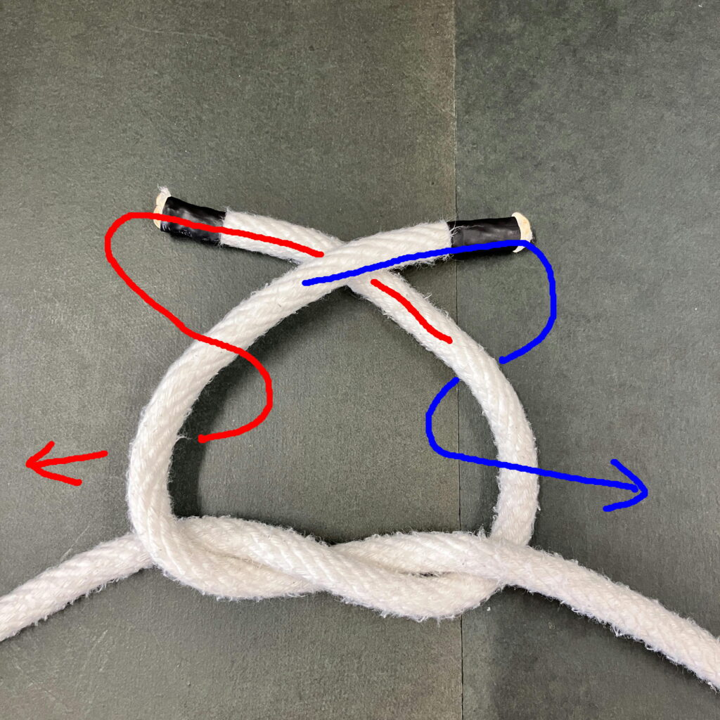 青の体の下にある赤の索端を青の索端の上に回す