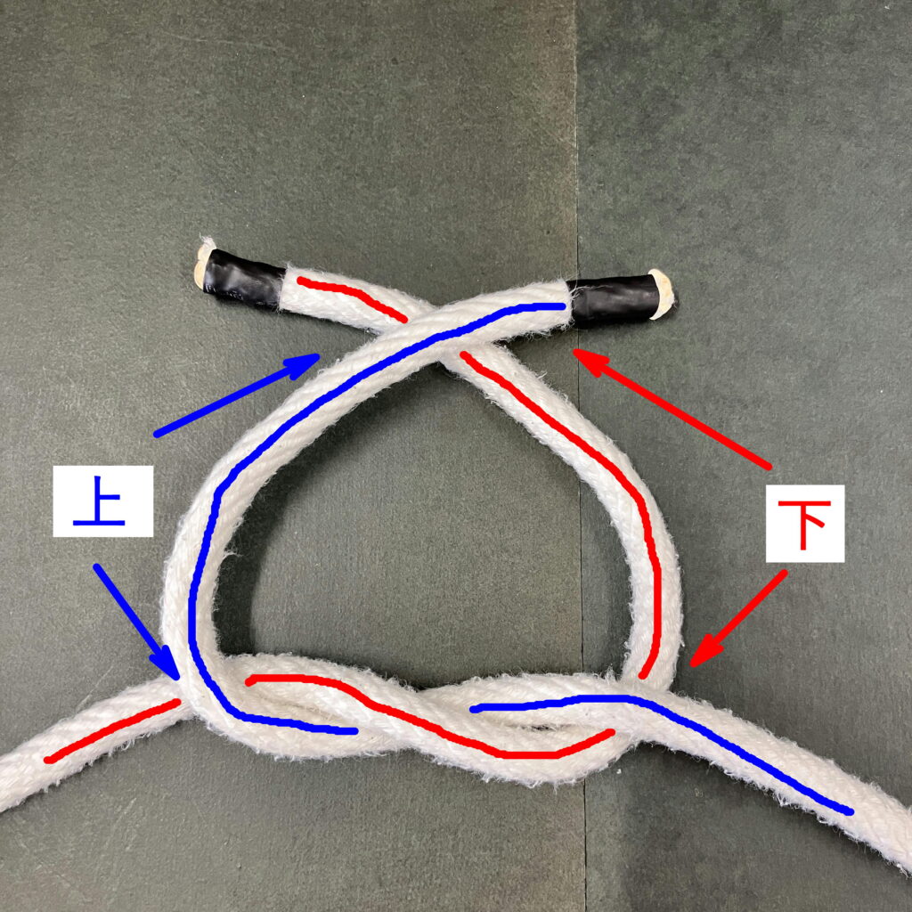 赤の索端を青の上から被せて下に通す
